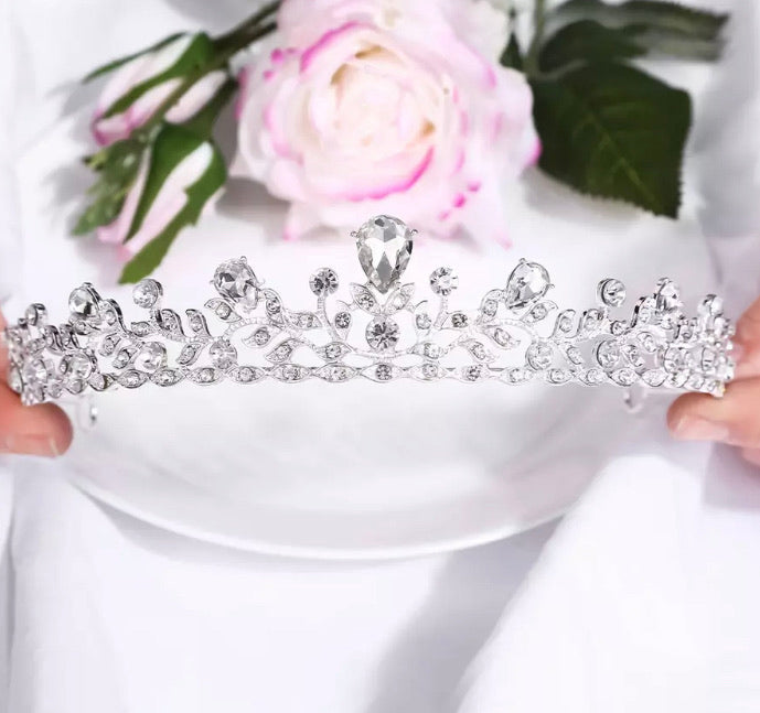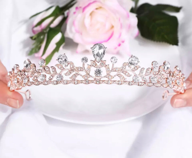 Rose Gold or Silver Coloured Tiara with lots of shiny stones and diamanté’s. Large teardrop crystal in centre and 2 smaller either side.