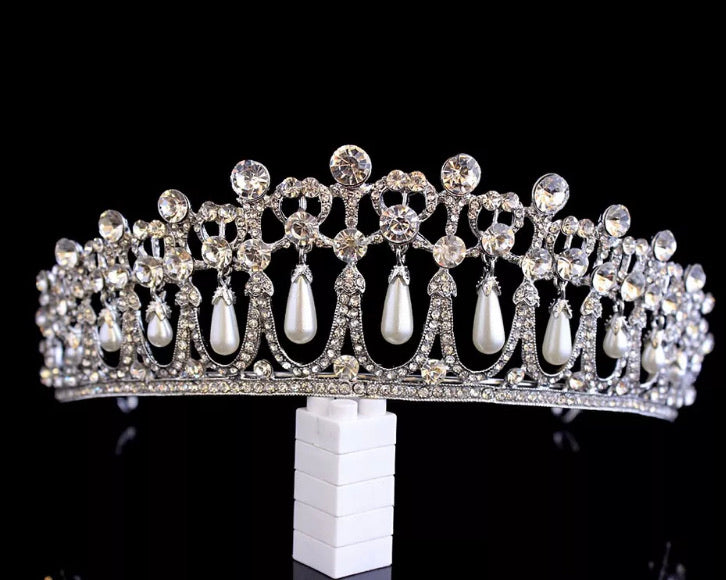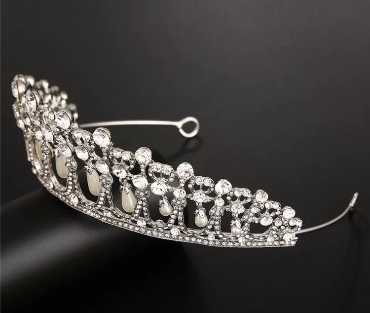 Silver coloured Tiara has pearls dangling in each little “arch” and lots of diamanté’s. approx 5 cm high.