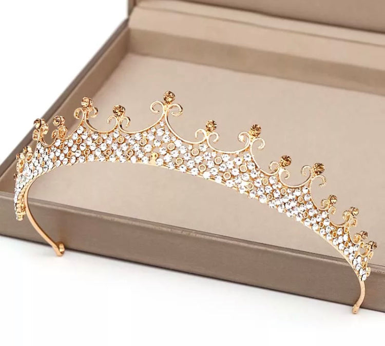 Gold with white crystals. Flower design across top with yellow coloured stone.