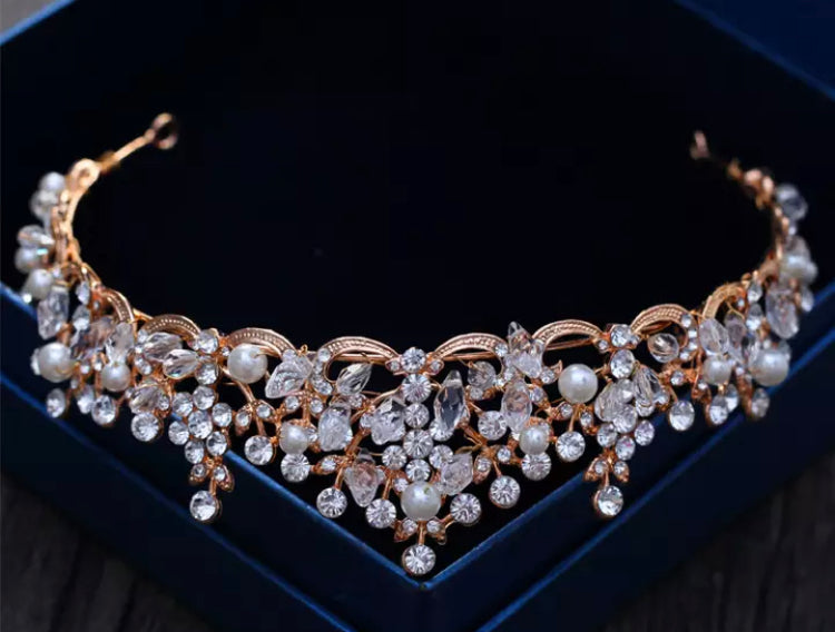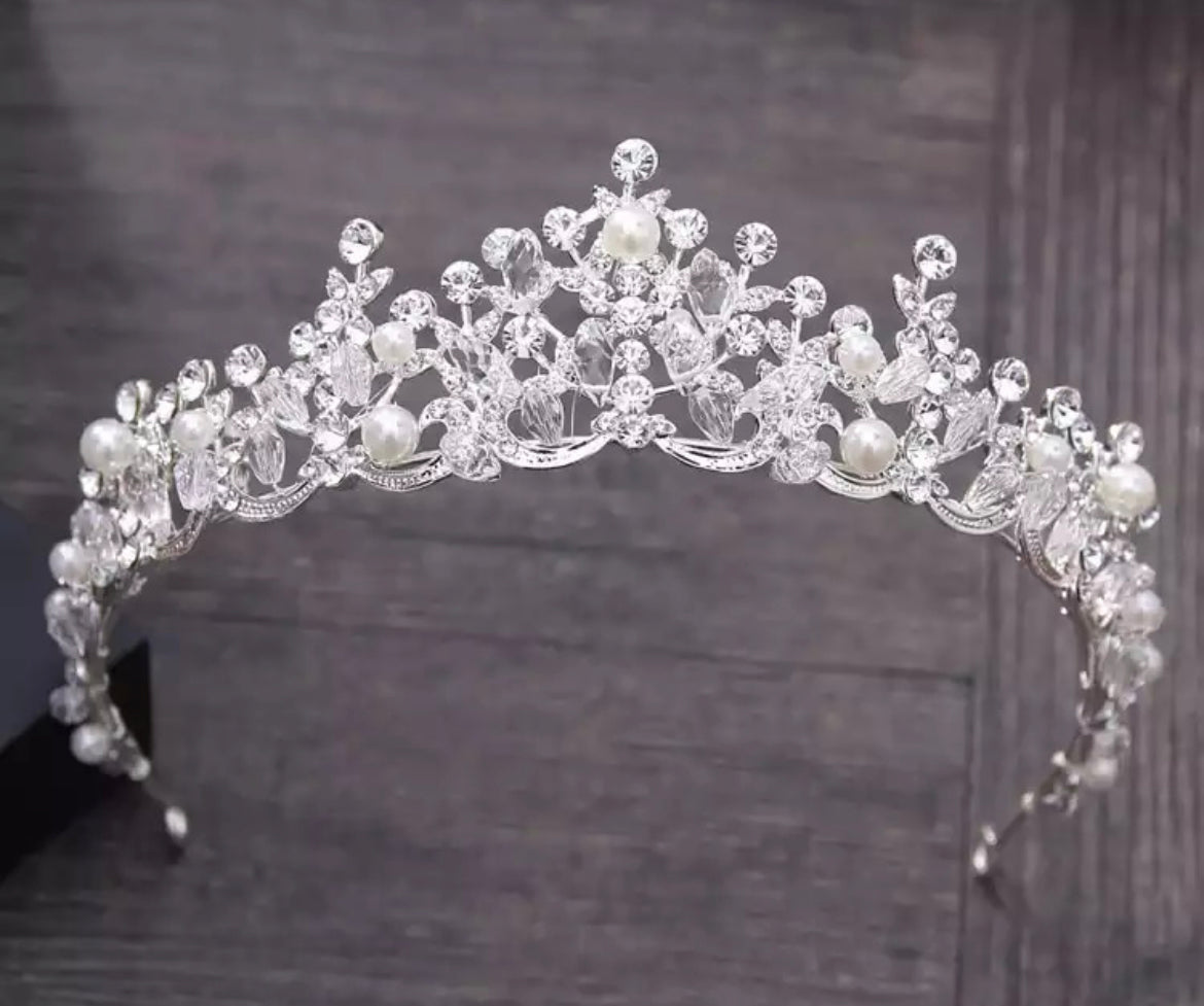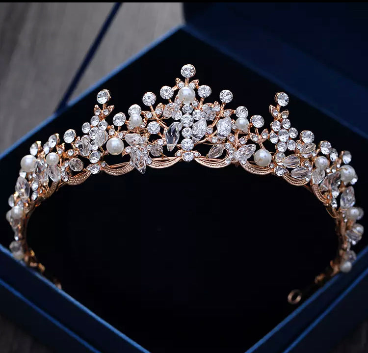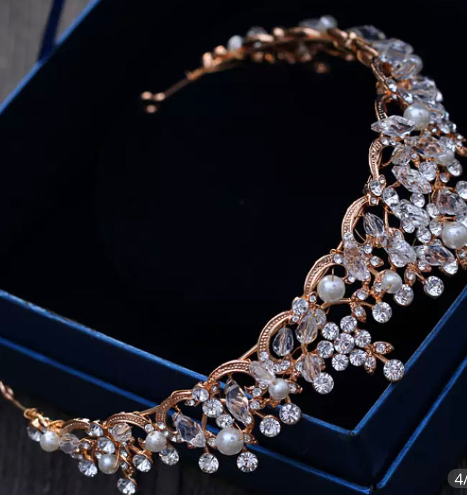 Rose gold or Silver coloured Tiara. Decorated with beautiful crystals rhinestones and pearls. 5 cm high at highest point.