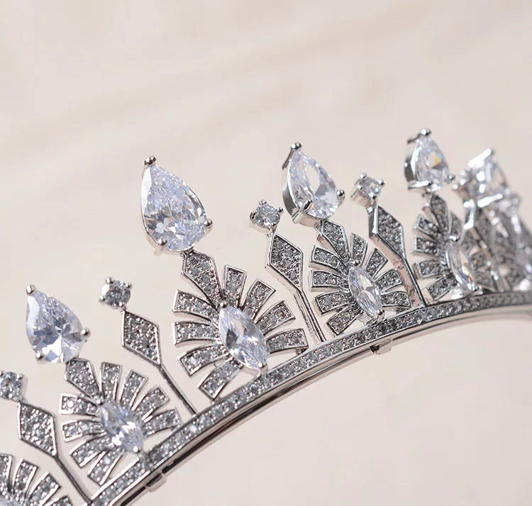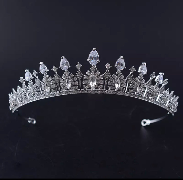 Silver coloured Tiara. has tear drop crystals resting on silver arches. Each arch has a silver crystal in the middle.